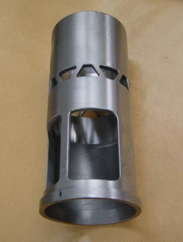 Our design for a cast iron valve liner. The photograph shows the trapezoidal transfer ports and large rectangular exhaust ports which ensure good breathing of the cylinders at high speeds when working with short cut-offs.