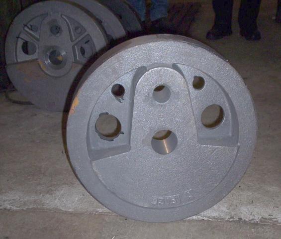 The outside surface of one of the wheel centre castings. The inner surface of another is also visible in the background. The castings have yet to be finally machined to take the axle, crankpin and tyres.