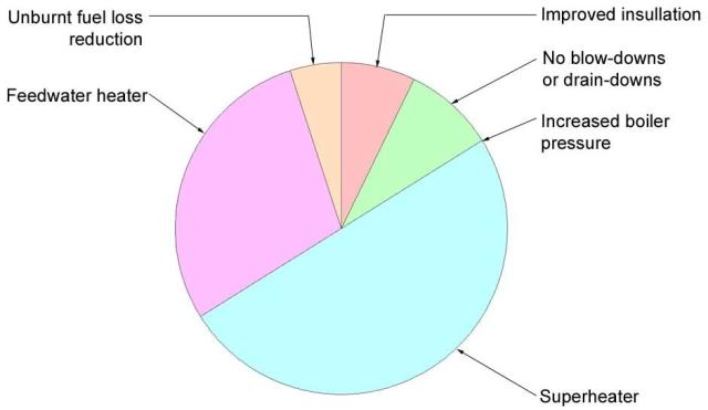 The possible water savings of 46% are large and once again the superheater contributes most at 21.3%, followed by avoidance of blowdowns by using the Porta Treatment at 14.3% and the feedwater heater at 7.5%. There are small savings from raising the boiler pressure of 2.4% and reduced use of the injectors and therefore water wastage of 0.9%.